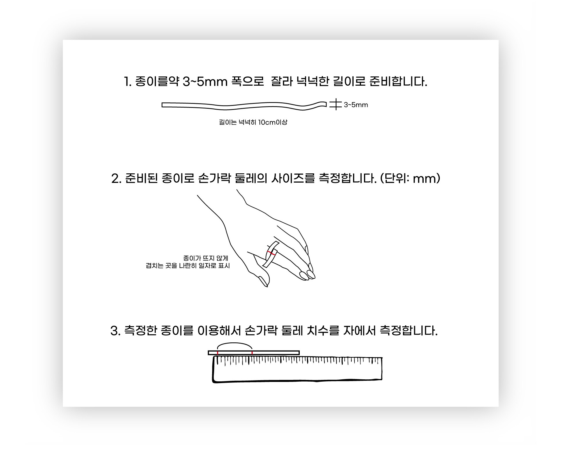 손가락에 종이가 쫀쫀하게 딱 맞도록 측정해주세요.